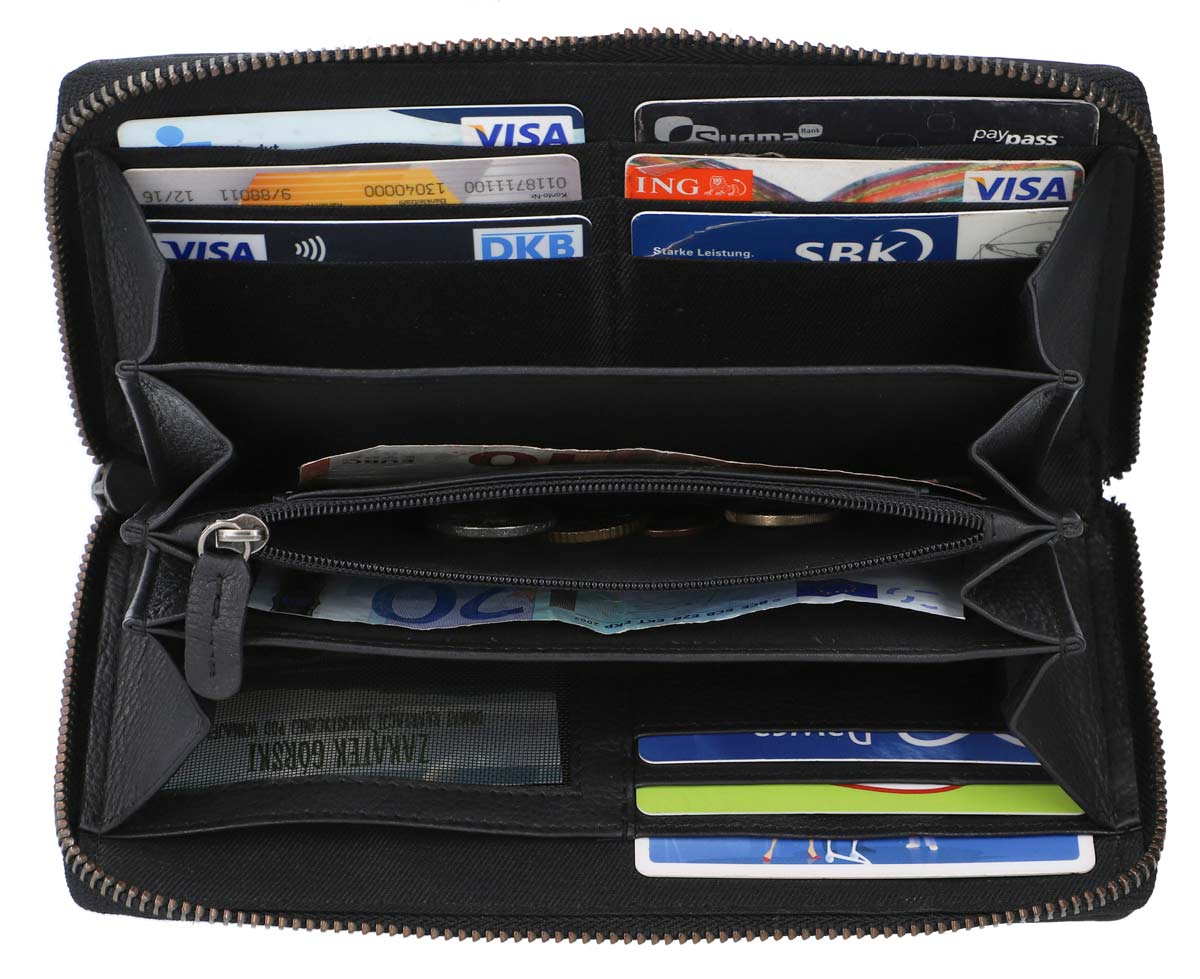 Innen verfügt „Cara“ über 5 Innenfächer – so hast Du Platz für all Deine kleinen und großen Geldscheine und Münzen. Die beiden Außenfächer bieten Platz für 10 Karten. In der Mitte befindet sich ein Münzfach mit Reißverschluss – und als besonders praktisches Extra kommt ein zusätzliches Münzfach für eine einzelne Münze dazu, damit Du Kleingeld noch schneller sortieren und griffbereit halten kannst. Neben dem Münzfach hast Du auf beiden Seiten schließlich Platz für Deine Geldscheine. Zusätzlich gibt es hinten noch ein Reißverschlussfach für das ein oder andere Mitbringsel. Ein großer, umlaufender Reißverschluss schützt Dein Hab und Gut zuverlässig, sodass auch nichts herausfallen kann. „Cara“ ist ein echtes Rundum-Paket, was Geldbörsen betrifft!