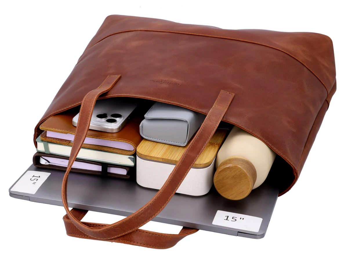 Ob nach der Arbeit noch in die Stadt, der Wocheneinkauf oder einfach Bummeln – "Carine" bietet Dir mit ihrem extragroßen Innenfach genug Platz für alles. Hier finden Dein 15-Zoll-Notebook, Trinkflasche, Geldbörse, diverse Notizbücher, Schlüssel und Stifteetui sicher ihren Platz. Dank der großen Öffnung ist zudem Raum für spontane Einkäufe. Die Tragehenkel aus echtem Leder runden das Design elegant ab. Die Maße der Tasche betragen 52,5 cm am Boden und 44 cm am oberen Rand.