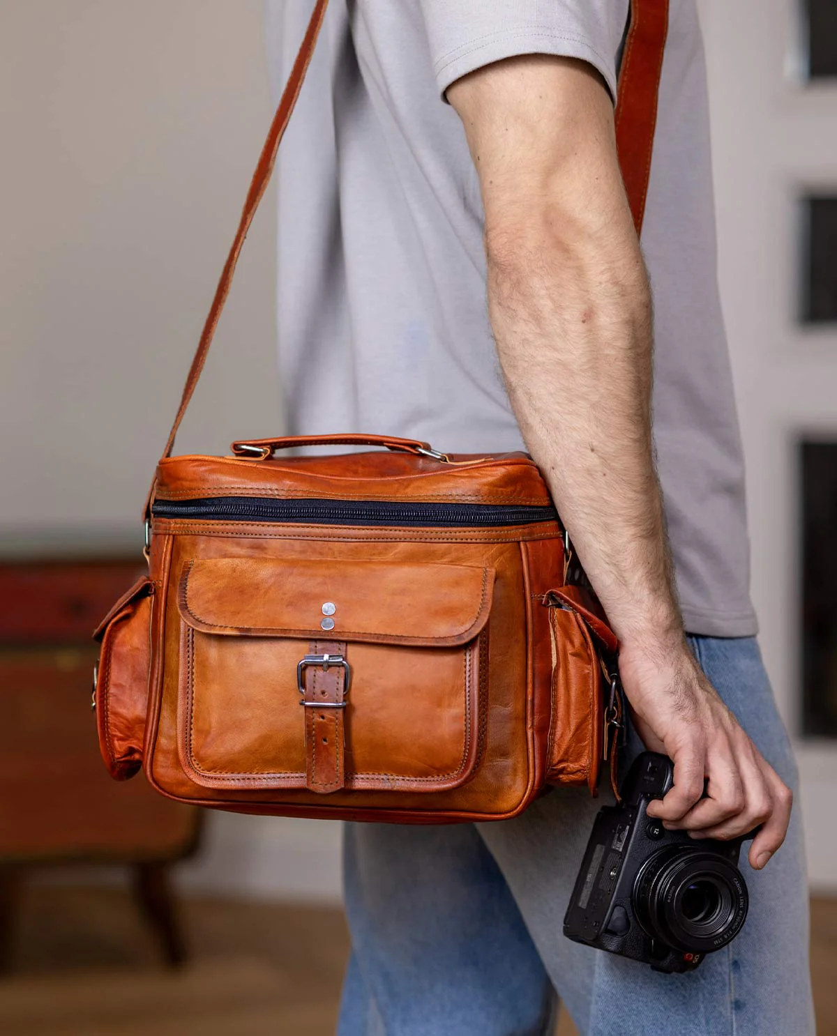 Diese Fototasche macht die kleine Zeitreise möglich - und das jeden Tag. Im angesagten Vintagelook weiß "Amanda" auf ganzer Linie zu überzeugen. Ob für das Shooting in der Stadt, die geplante Fotosafari oder lediglich als Freizeittasche - hier hast Du den perfekten Begleiter für Deine Abenteuer gefunden. Im Inneren ist viel Platz für Deine Kamera und Objektive. Zusätzlich stehen Dir drei Außentaschen zur Verfügung, in welchen Du Kleinigkeiten griffbereit unterbringen kannst. Das Innnefach wird sicher mit einem Reißverschluss abgesichert, die Außenfacher mit Schnallen. Das braune Ziegenleder wurde naturgegerbt und verleiht der Tasche somit den letzten Schliff und Charme, der sie so einzigartig macht.
